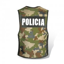 Chaleco Táctico camuflado confeccionado en tela y cordura importada de alta resistencia con bolsillo para handy o celular, cargadores, esposas y ojales para municiones. Sistema de ajuste lateral y cierre central en el pecho.